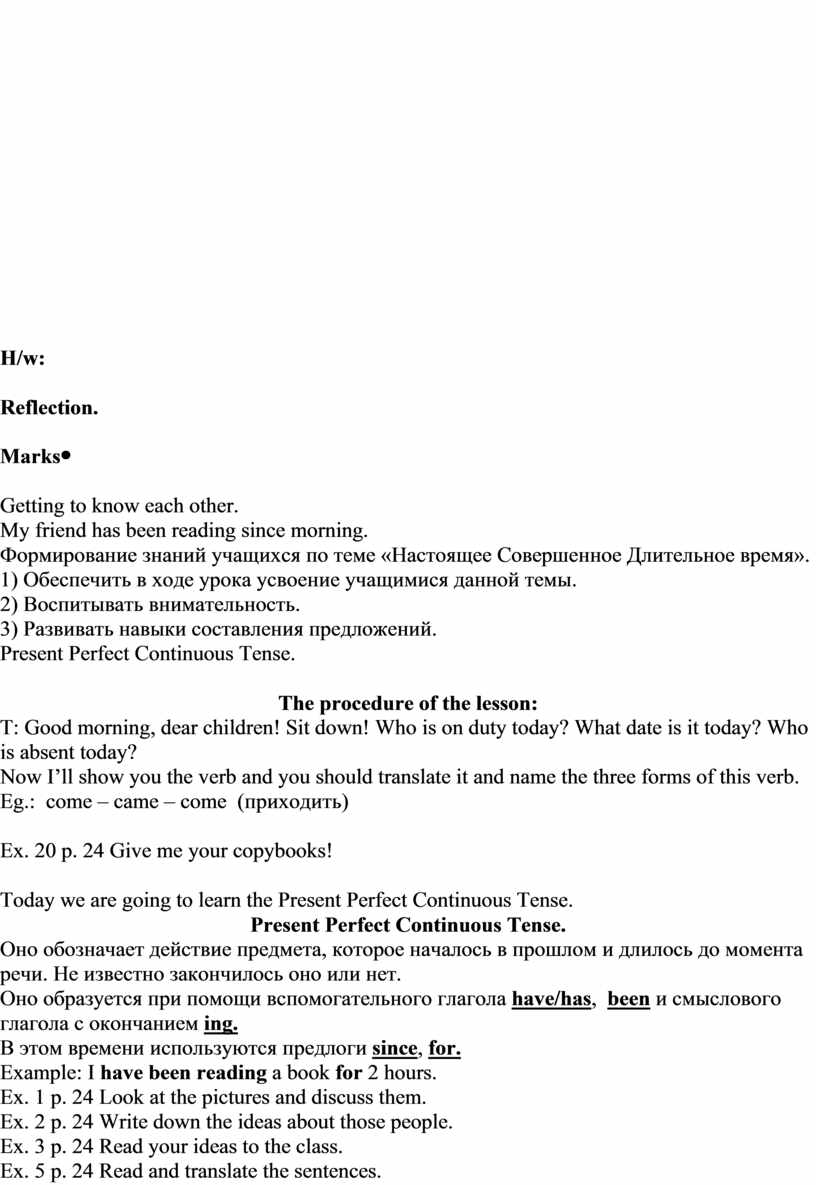Getting to know each other. My friend has been reading since morning. Формирование знаний учащихся по теме «Настоящее Совершенное Длительное время». 1) Обеспечить в ходе урока усвоение учащимися данной темы. 2) Воспитывать внимательность. 3) Развивать навыки составления предложений. Present Perfect Continuous Tense.