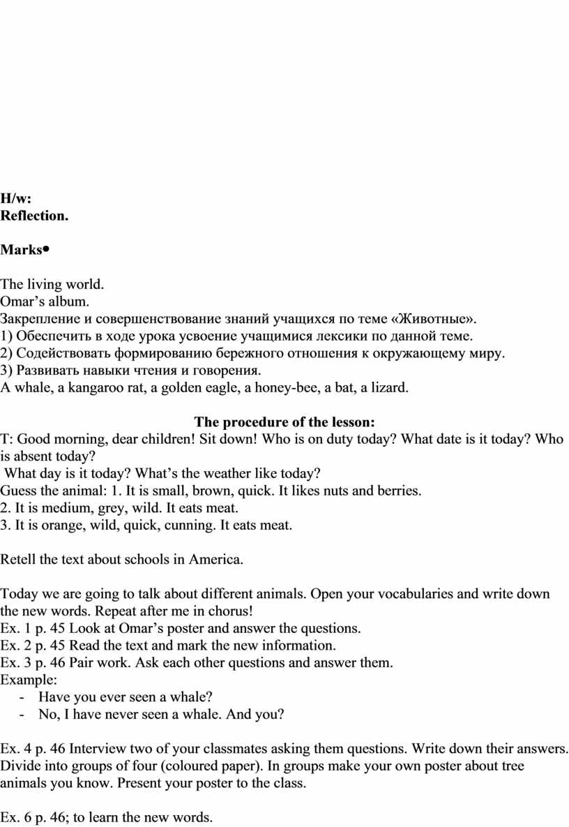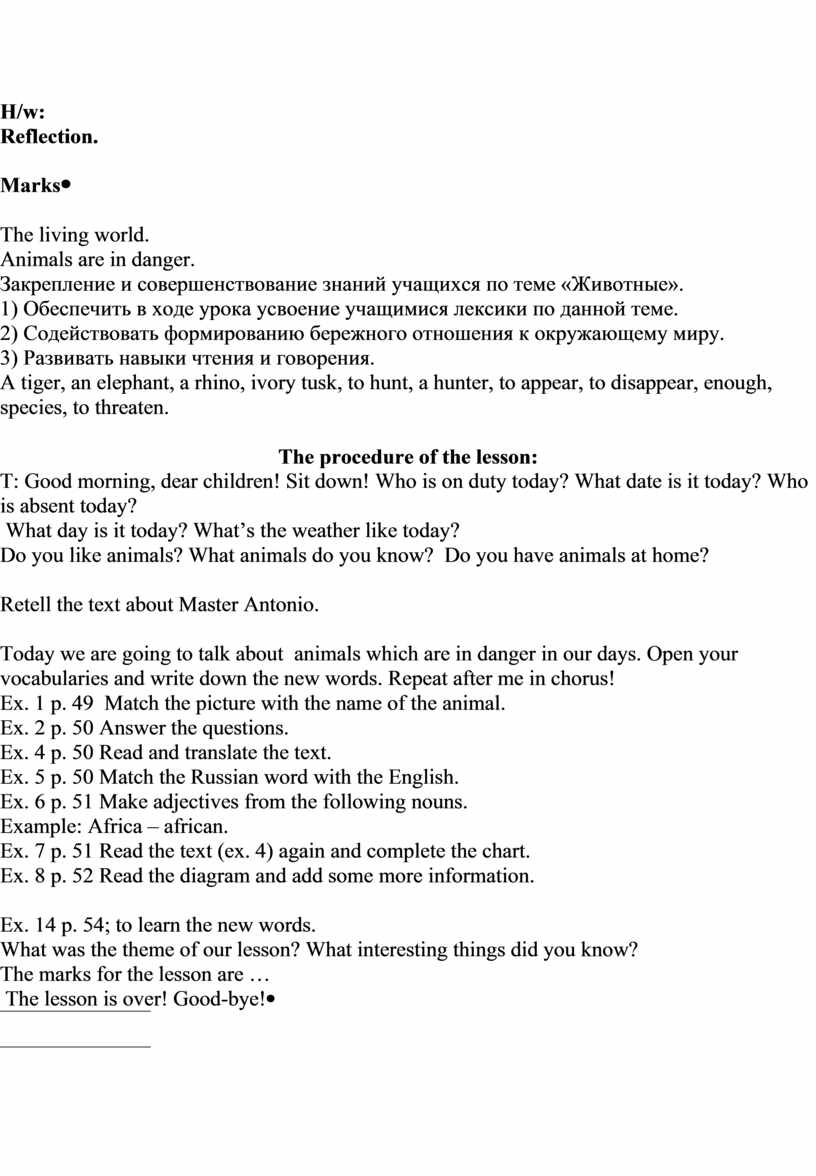Ex. 15 p. 59; to learn the new words. What was the theme of our lesson? What interesting things did you know? The marks for the lesson are … The lesson is over! Good-bye! |
