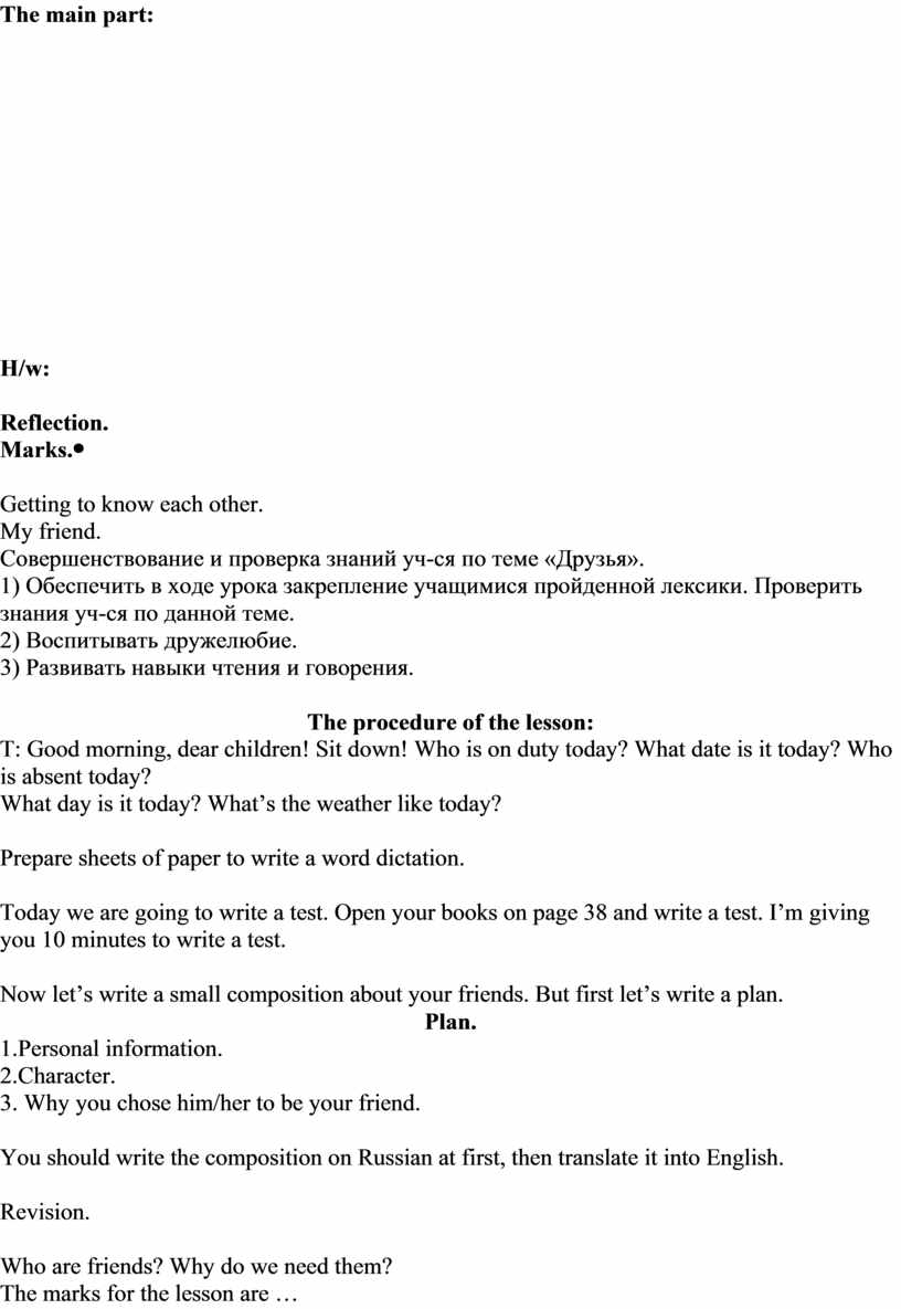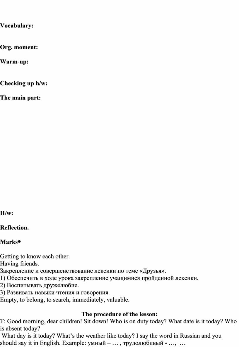 The procedure of the lesson: T: Good morning, dear children! Sit down! Who is on duty today? What date is it today? Who is absent today? What day is it today? What’s the weather like today? Do you have friends? Who are they?
