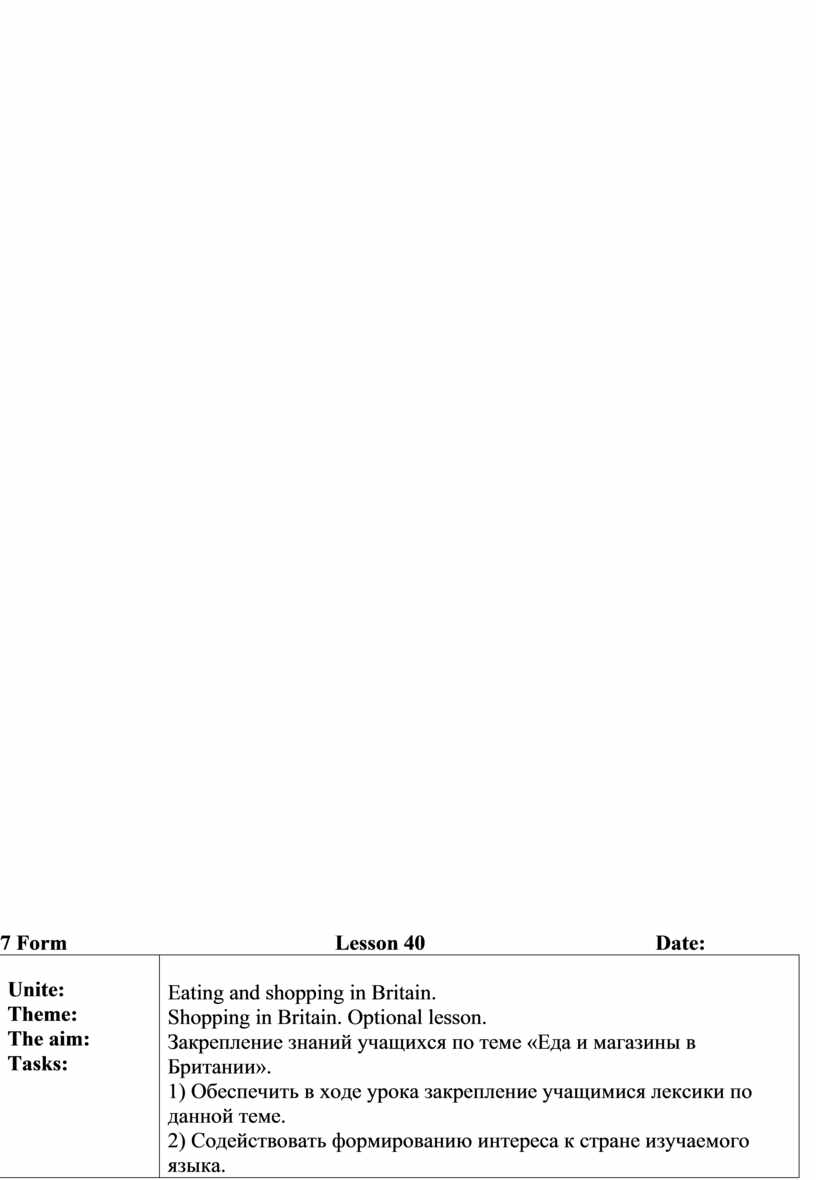 Eating and shopping in Britain. Shopping in Britain. Optional lesson. Закрепление знаний учащихся по теме «Еда и магазины в Британии». 1) Обеспечить в ходе урока закрепление учащимися лексики по данной теме. 2) Содействовать формированию интереса к стране изучаемого языка. 3) Развивать навыки чтения и говорения.