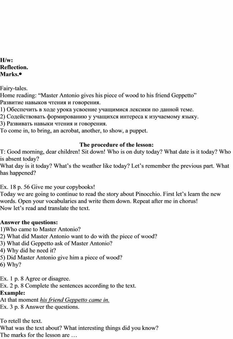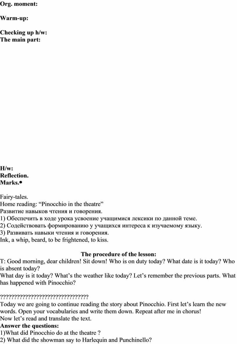 The procedure of the lesson: T: Good morning, dear children! Sit down! Who is on duty today? What date is it today? Who is absent today? What day is it today? What’s the weather like today? Let’s remember the previous parts. What has happened with Pinocchio?