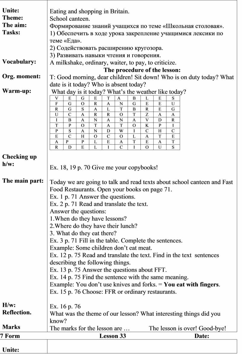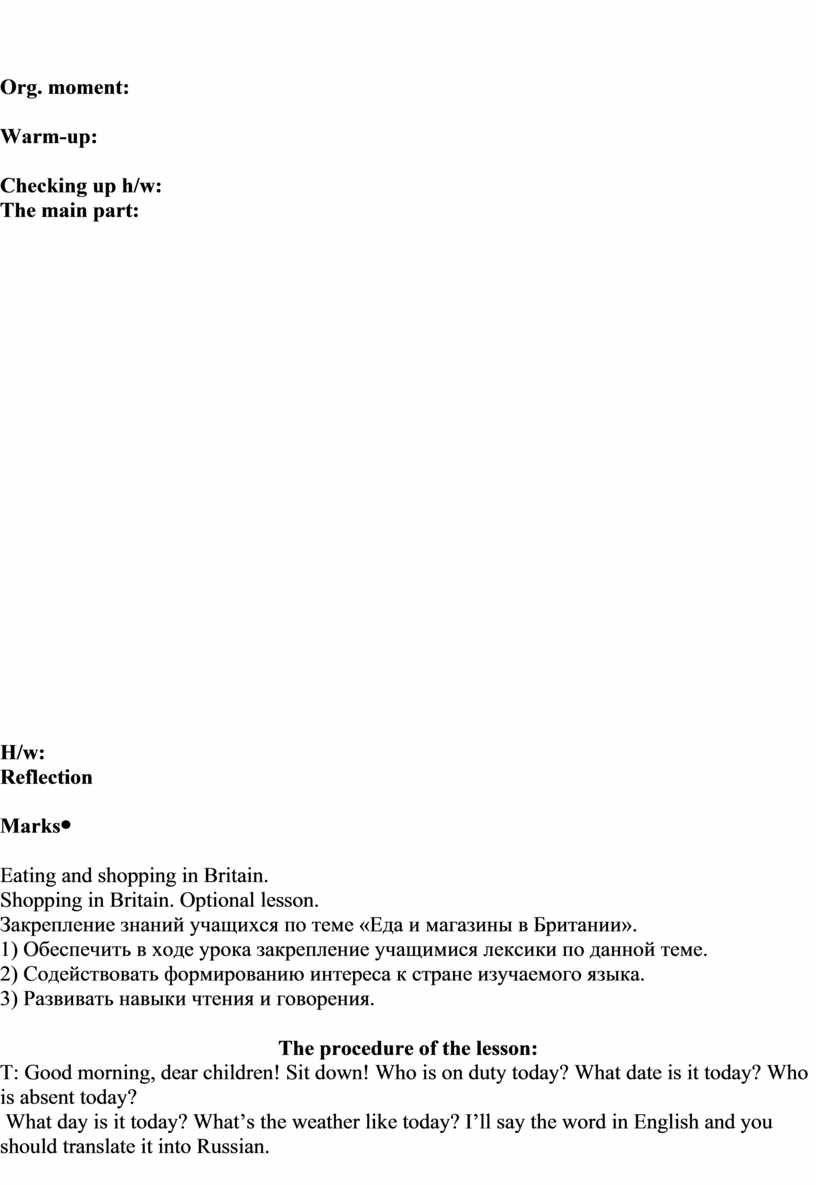 Eating and shopping in Britain. School canteen. Формирование знаний учащихся по теме «Школьная столовая». 1) Обеспечить в ходе урока закрепление учащимися лексики по теме «Еда». 2) Содействовать расширению кругозора. 3) Развивать навыки чтения и говорения. A milkshake, ordinary, waiter, to pay, to criticize. The procedure of the lesson: T: Good morning, dear children! Sit down! Who is on duty today? What date is it today? Who is absent today? What day is it today? What’s the weather like today?