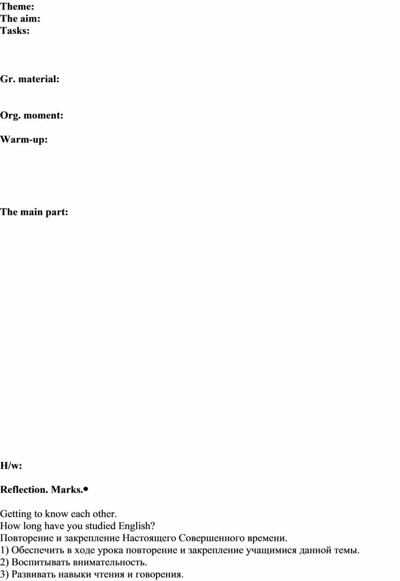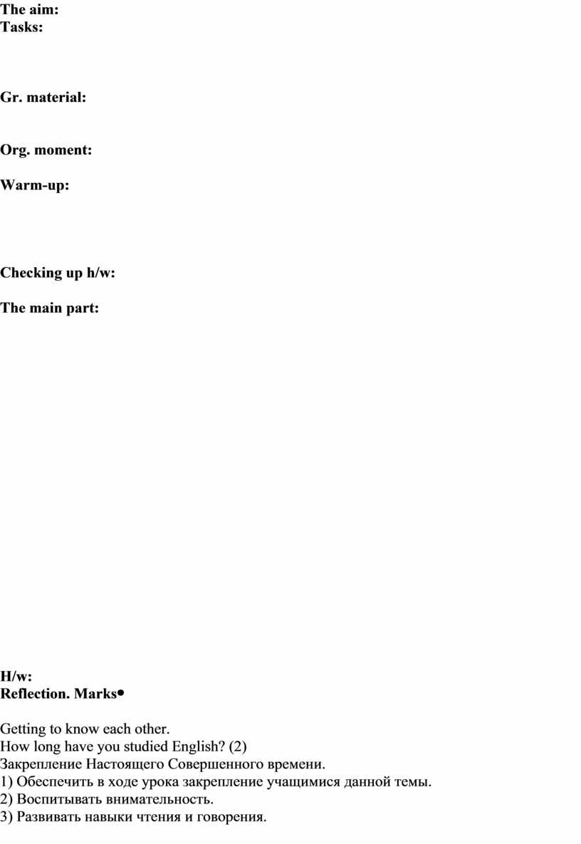 Getting to know each other. How long have you studied English? (2) Закрепление Настоящего Совершенного времени. 1) Обеспечить в ходе урока закрепление учащимися данной темы. 2) Воспитывать внимательность. 3) Развивать навыки чтения и говорения.