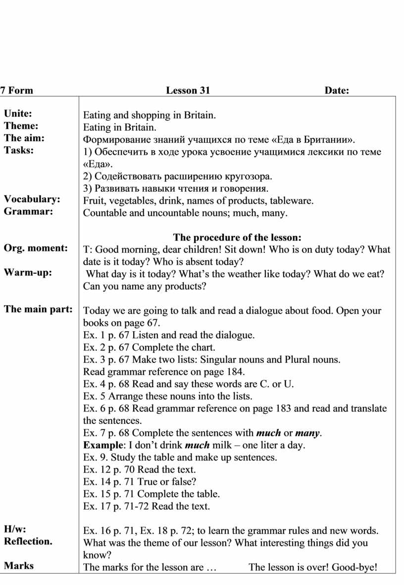 Today we are going to talk and read a dialogue about food. Open your books on page 67. Ex. 1 p. 67 Listen and read the dialogue. Ex. 2 p. 67 Complete the chart. Ex. 3 p. 67 Make two lists: Singular nouns and Plural nouns. Read grammar reference on page 184. Ex. 4 p. 68 Read and say these words are C. or U. Ex. 5 Arrange these nouns into the lists. Ex. 6 p. 68 Read grammar reference on page 183 and read and translate the sentences. Ex. 7 p. 68 Complete the sentences with much or many. Example: I don’t drink much milk – one liter a day. Ex. 9. Study the table and make up sentences. Ex. 12 p. 70 Read the text. Ex. 14 p. 71 True or false? Ex. 15 p. 71 Complete the table. Ex. 17 p. 71-72 Read the text.