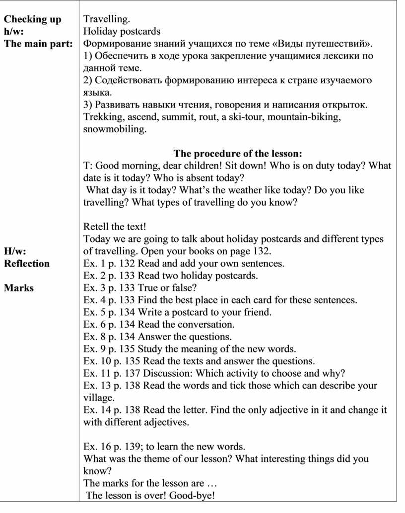 Retell the text! Today we are going to talk about holiday postcards and different types of travelling. Open your books on page 132. Ex. 1 p. 132 Read and add your own sentences. Ex. 2 p. 133 Read two holiday postcards. Ex. 3 p. 133 True or false? Ex. 4 p. 133 Find the best place in each card for these sentences. Ex. 5 p. 134 Write a postcard to your friend. Ex. 6 p. 134 Read the conversation. Ex. 8 p. 134 Answer the questions. Ex. 9 p. 135 Study the meaning of the new words. Ex. 10 p. 135 Read the texts and answer the questions. Ex. 11 p. 137 Discussion: Which activity to choose and why? Ex. 13 p. 138 Read the words and tick those which can describe your village. Ex. 14 p. 138 Read the letter. Find the only adjective in it and change it with different adjectives.