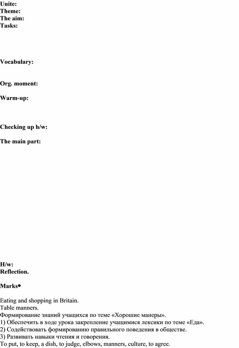 Eating and shopping in Britain. Table manners. Формирование знаний учащихся по теме «Хорошие манеры». 1) Обеспечить в ходе урока закрепление учащимися лексики по теме «Еда». 2) Содействовать формированию правильного поведения в обществе. 3) Развивать навыки чтения и говорения. To put, to keep, a dish, to judge, elbows, manners, culture, to agree.