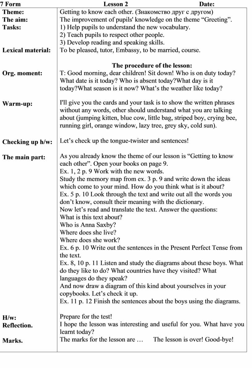 As you already know the theme of our lesson is “Getting to know each other”. Open your books on page 9. Ex. 1, 2 p. 9 Work with the new words. Study the memory map from ex. 3 p. 9 and write down the ideas which come to your mind. How do you think what is it about? Ex. 5 p. 10 Look through the text and write out all the words you don’t know, consult their meaning with the dictionary. Now let’s read and translate the text. Answer the questions: What is this text about? Who is Anna Saxby? Where does she live? Where does she work? Ex. 6 p. 10 Write out the sentences in the Present Perfect Tense from the text. Ex. 8, 10 p. 11 Listen and study the diagrams about these boys. What do they like to do? What countries have they visited? What languages do they speak? And now draw a diagram of this kind about yourselves in your copybooks. Let’s check it up. Ex. 11 p. 12 Finish the sentences about the boys using the diagrams.