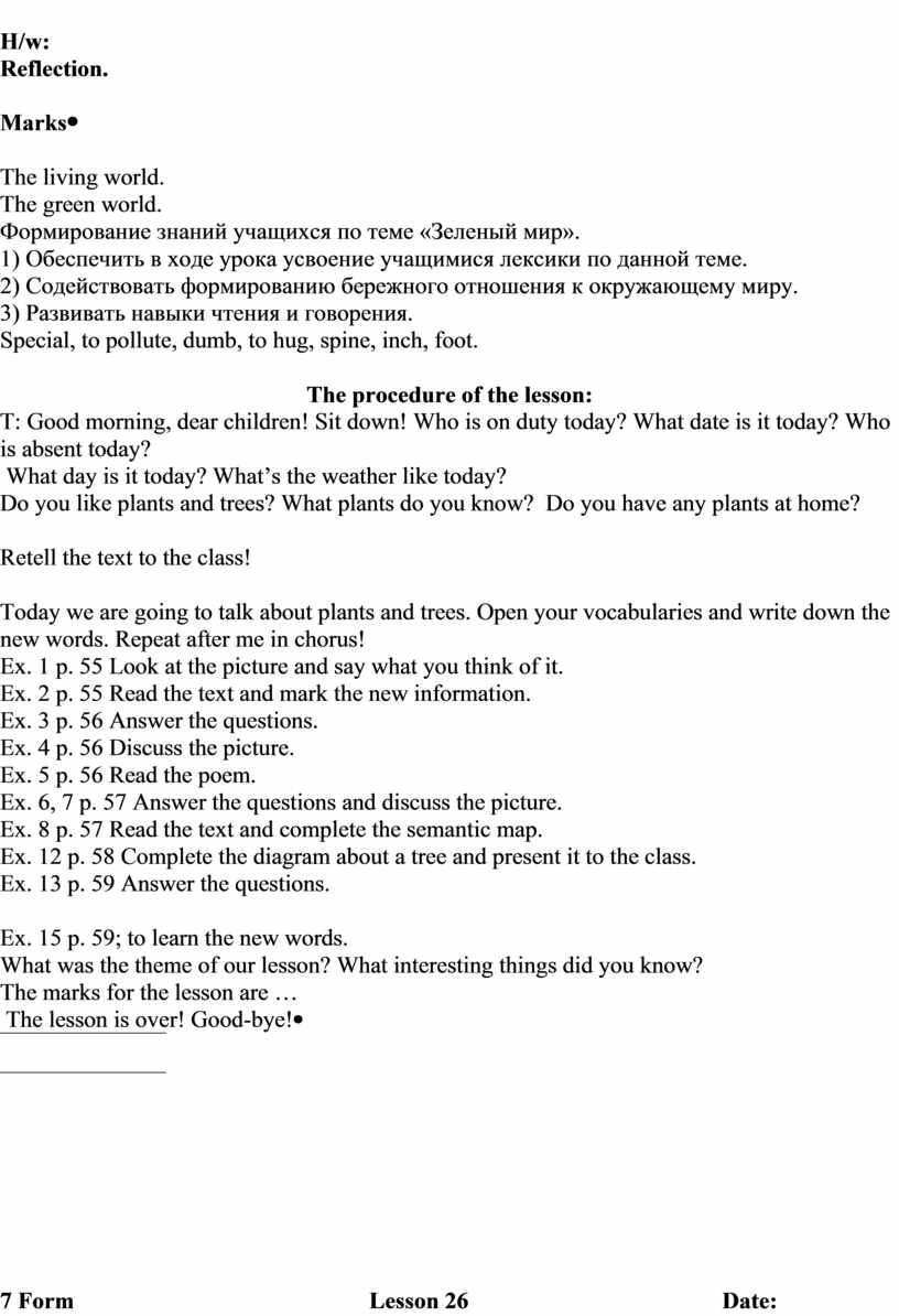Today we are going to talk about plants and trees. Open your vocabularies and write down the new words. Repeat after me in chorus! Ex. 1 p. 55 Look at the picture and say what you think of it. Ex. 2 p. 55 Read the text and mark the new information. Ex. 3 p. 56 Answer the questions. Ex. 4 p. 56 Discuss the picture. Ex. 5 p. 56 Read the poem. Ex. 6, 7 p. 57 Answer the questions and discuss the picture. Ex. 8 p. 57 Read the text and complete the semantic map. Ex. 12 p. 58 Complete the diagram about a tree and present it to the class. Ex. 13 p. 59 Answer the questions.