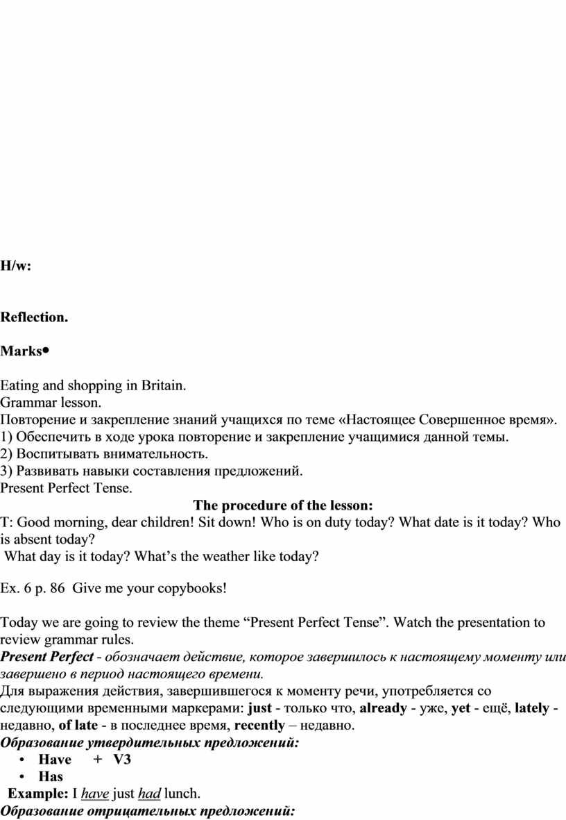 Eating and shopping in Britain. Grammar lesson. Повторение и закрепление знаний учащихся по теме «Настоящее Совершенное время». 1) Обеспечить в ходе урока повторение и закрепление учащимися данной темы. 2) Воспитывать внимательность. 3) Развивать навыки составления предложений. Present Perfect Tense. The procedure of the lesson: T: Good morning, dear children! Sit down! Who is on duty today? What date is it today? Who is absent today? What day is it today? What’s the weather like today?
