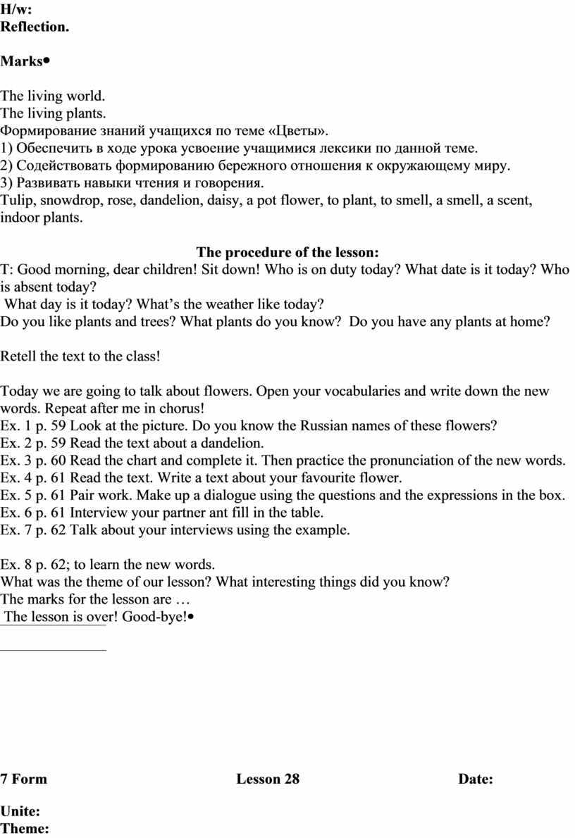 Today we are going to talk about flowers. Open your vocabularies and write down the new words. Repeat after me in chorus! Ex. 1 p. 59 Look at the picture. Do you know the Russian names of these flowers? Ex. 2 p. 59 Read the text about a dandelion. Ex. 3 p. 60 Read the chart and complete it. Then practice the pronunciation of the new words. Ex. 4 p. 61 Read the text. Write a text about your favourite flower. Ex. 5 p. 61 Pair work. Make up a dialogue using the questions and the expressions in the box. Ex. 6 p. 61 Interview your partner ant fill in the table. Ex. 7 p. 62 Talk about your interviews using the example.