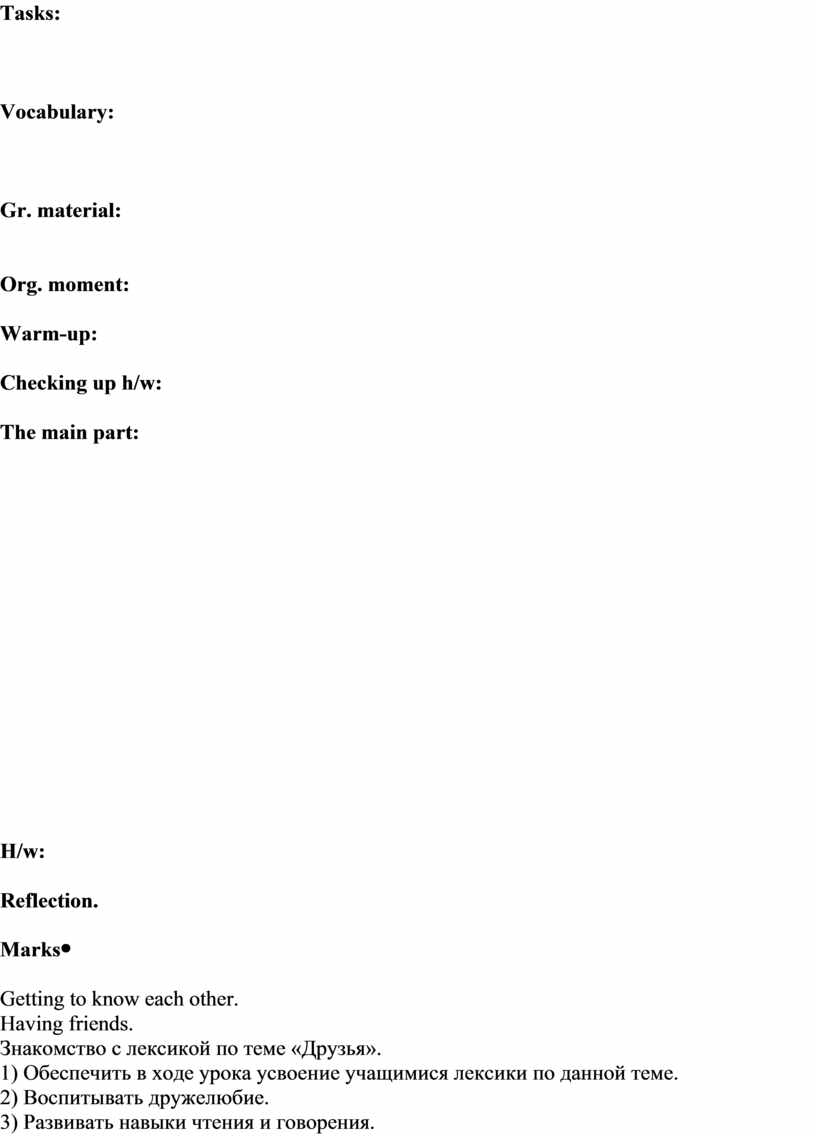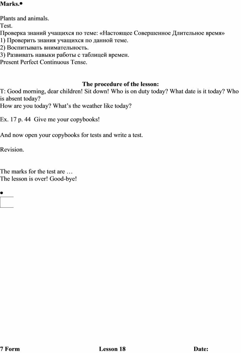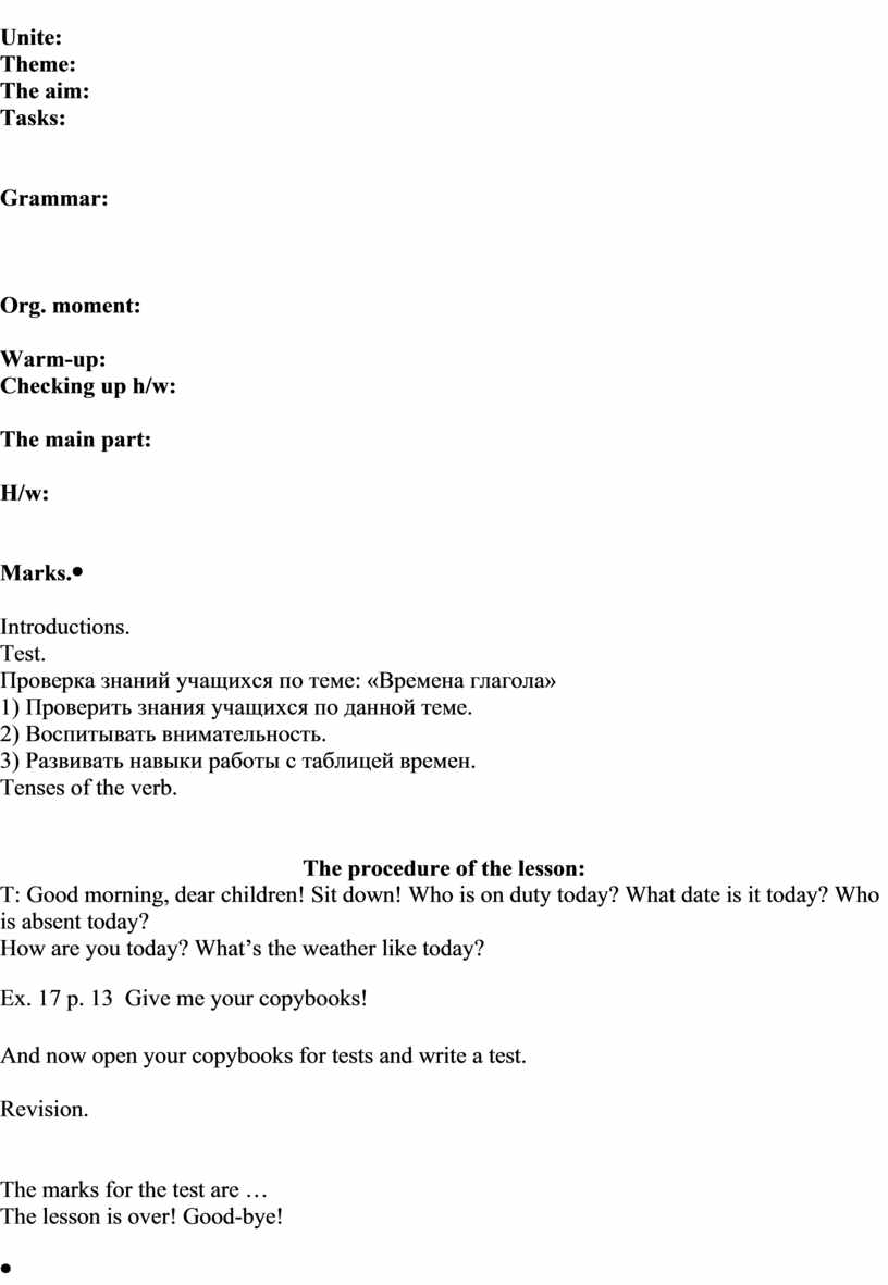 1.To learn the time markers 2. Ex. 6 p. 16 What was the theme of our lesson? Tell me the grammar rules. The marks for the lesson are … The lesson is over! Good-bye! |