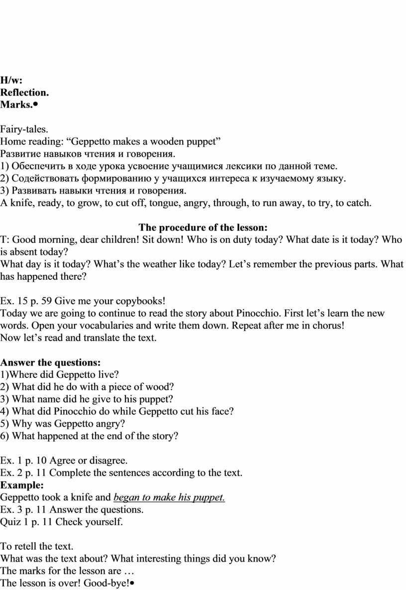Ex. 1 p. 10 Agree or disagree. Ex. 2 p. 11 Complete the sentences according to the text. Example: Geppetto took a knife and began to make his puppet. Ex. 3 p. 11 Answer the questions. Quiz 1 p. 11 Check yourself.