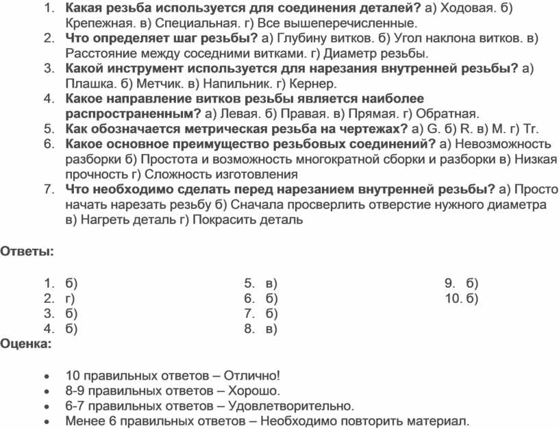 1. Что такое резьба? а) Способ соединения деталей с помощью клея. б) Винтовая поверхность, образованная на деталях для соединения или передачи движения. в) Способ соединения деталей с помощью сварки. г) Специальный вид краски для металла.