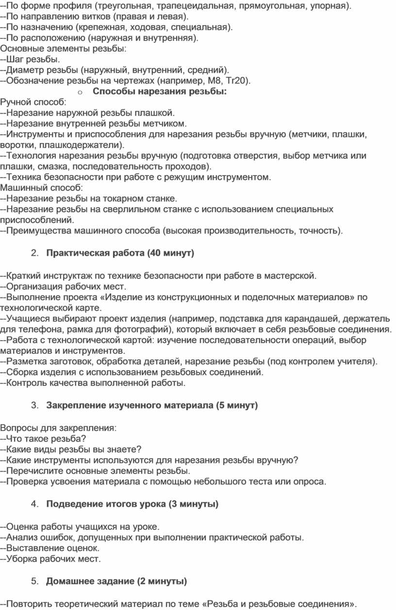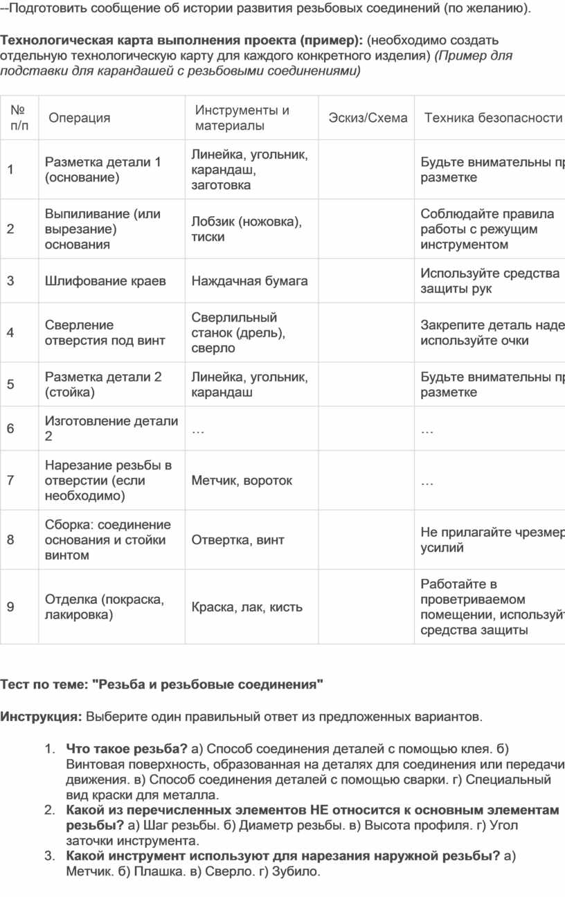 Тема урока: Резьба и резьбовые соединения. Способы нарезания резьбы. Выполнение проекта «Изделие из конструкционных и поделочных материалов» по технологической карте.