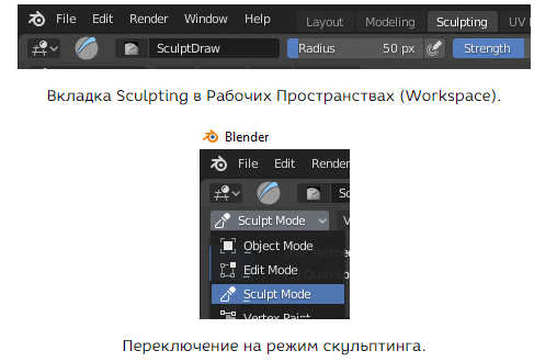 Если нужно отскульптить уже существующий меш, воспользуйтесь вкладкой Sculpting в Рабочих Пространствах (Workspace), либо сменой режима с Object Mode на Sculpt Mode.