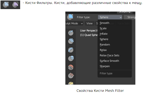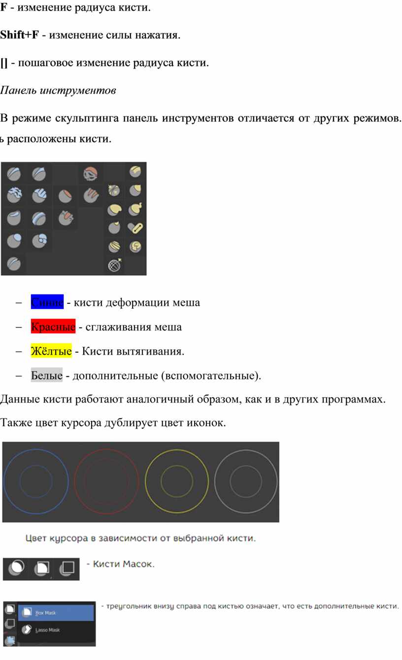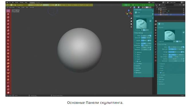 В режиме скульптинга панель инструментов отличается от других режимов. Здесь расположены кисти.