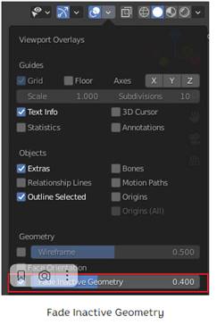 Затемнение неактивных объектов регулируется в Viewport Overlays - Fade Inactive Geometry