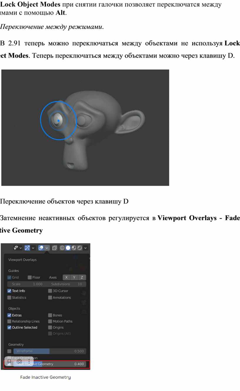Но учтите, что в Режиме Редактирования (Edit Mode) не будет работать выделение лупа (ЛКМ+Alt), а так же Lock Object Modes в меню Edit.