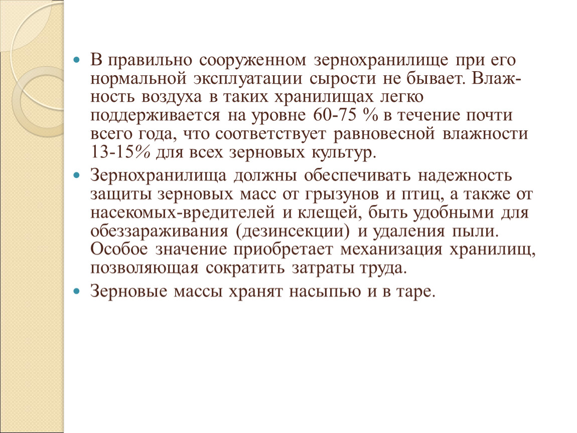 В правильно сооруженном зернохранилище при его нормальной эксплуатации сырости не бывает. Влажность воздуха в таких хранилищах легко поддерживается на уровне 60-75 % в течение почти всего года, что соответствует равновесной влажности 13-15% для всех зерновых культур.
