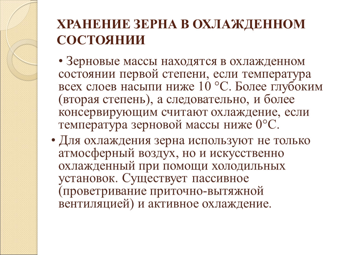 • Зерновые массы находятся в охлажденном состоянии первой степени, если температура всех слоев насыпи ниже 10 °С. Более глубоким (вторая степень), а следовательно, и более консервирующим считают охлаждение, если температура зерновой массы ниже 0°С.