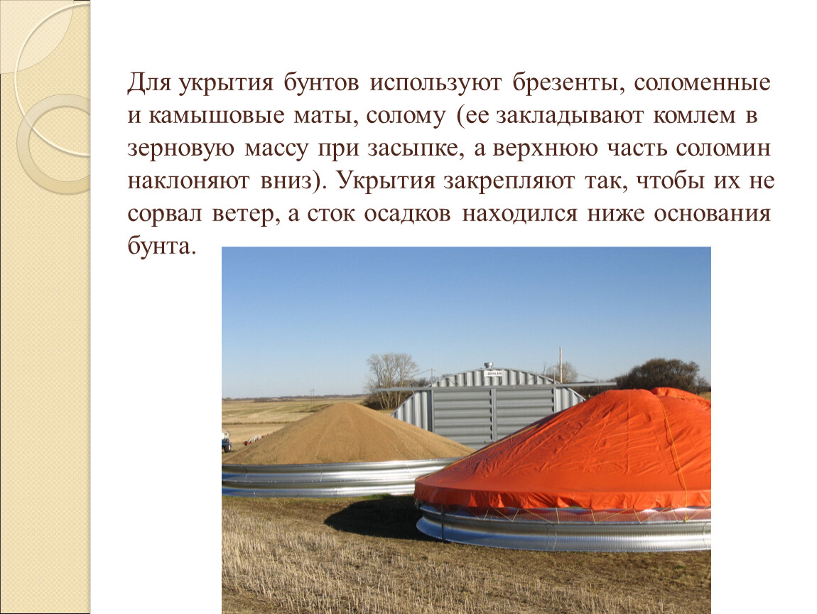 Для укрытия бунтов используют брезенты, соломенные и камышовые маты, солому (ее закладывают комлем в зерновую массу при засыпке, а верхнюю часть соломин наклоняют вниз). Укрытия закрепляют так, чтобы их не сорвал ветер, а сток осадков находился ниже основания бунта.