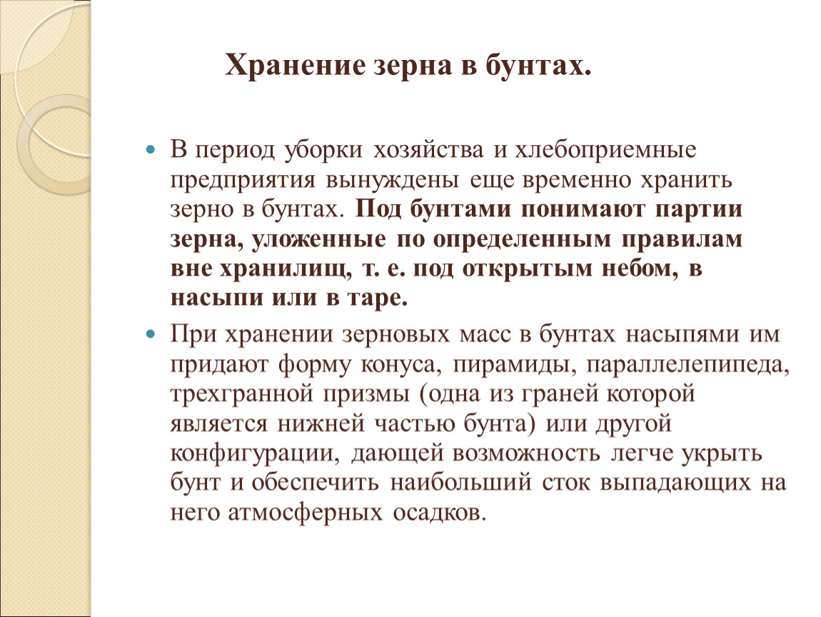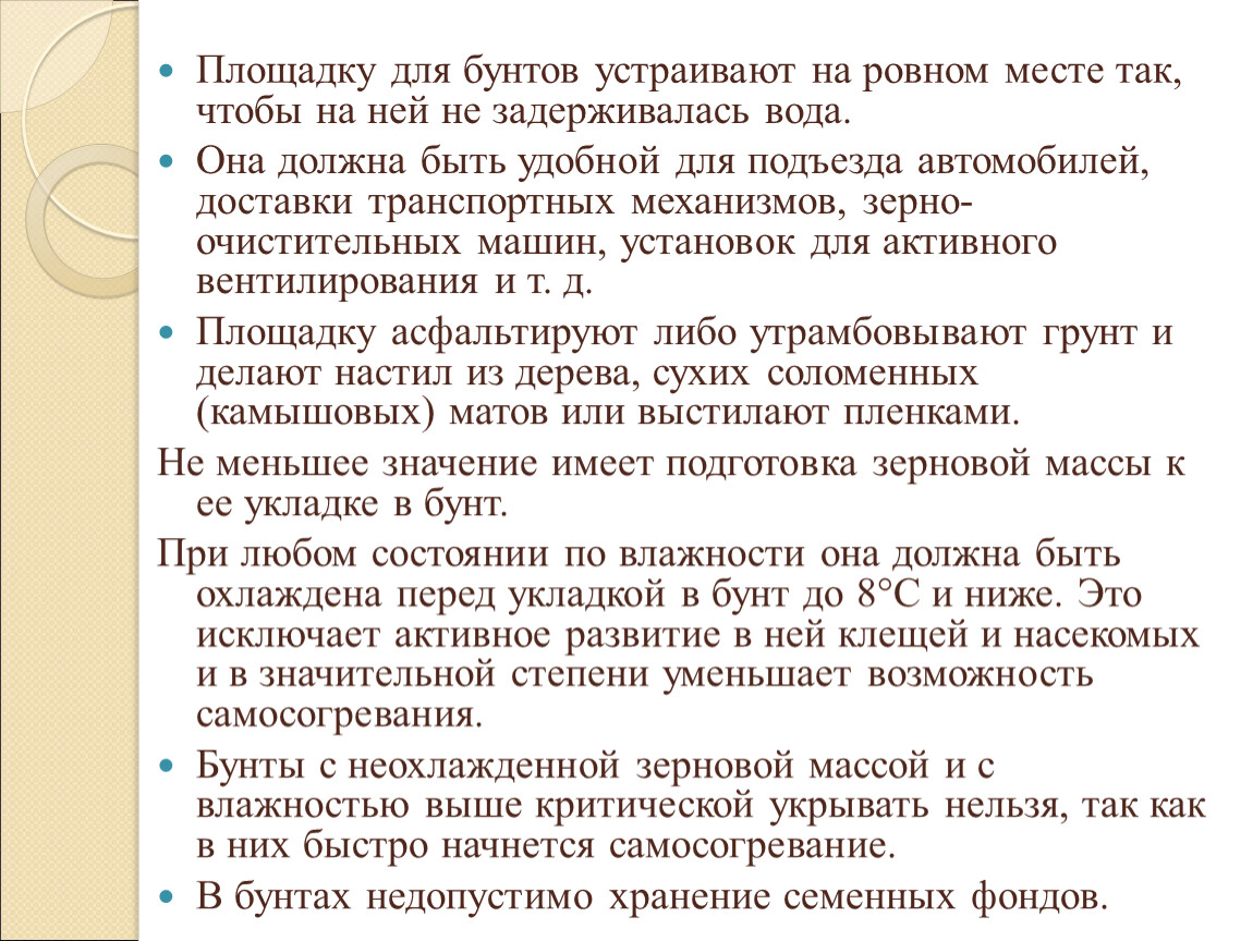 В период уборки хозяйства и хлебоприемные предприятия вынуждены еще временно хранить зерно в бунтах. Под бунтами понимают партии зерна, уложенные по определенным правилам вне хранилищ, т. е. под открытым небом, в насыпи или в таре.