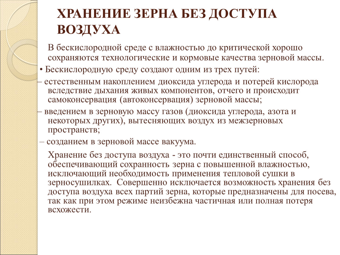 В бескислородной среде с влажностью до критической хорошо сохраняются технологические и кормовые качества зерновой массы.