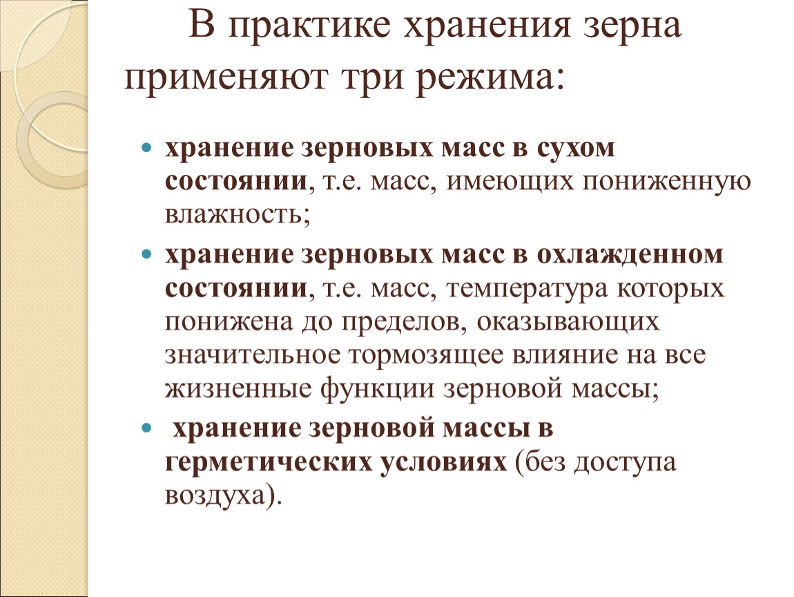 В практике хранения зерна применяют три режима: