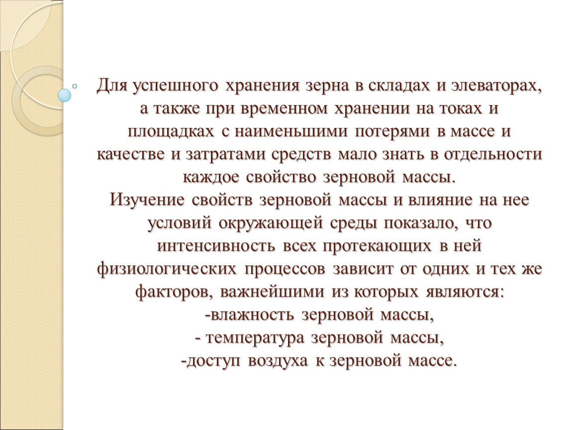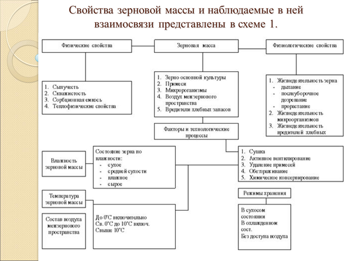 Для успешного хранения зерна в складах и элеваторах, а также при временном хранении на токах и площадках с наименьшими потерями в массе и качестве и затратами средств мало знать в отдельности каждое свойство зерновой массы.Изучение свойств зерновой массы и влияние на нее условий окружающей среды показало, что интенсивность всех протекающих в ней физиологических процессов зависит от одних и тех же факторов, важнейшими из которых являются: -влажность зерновой массы, - температура зерновой массы, -доступ воздуха к зерновой массе.