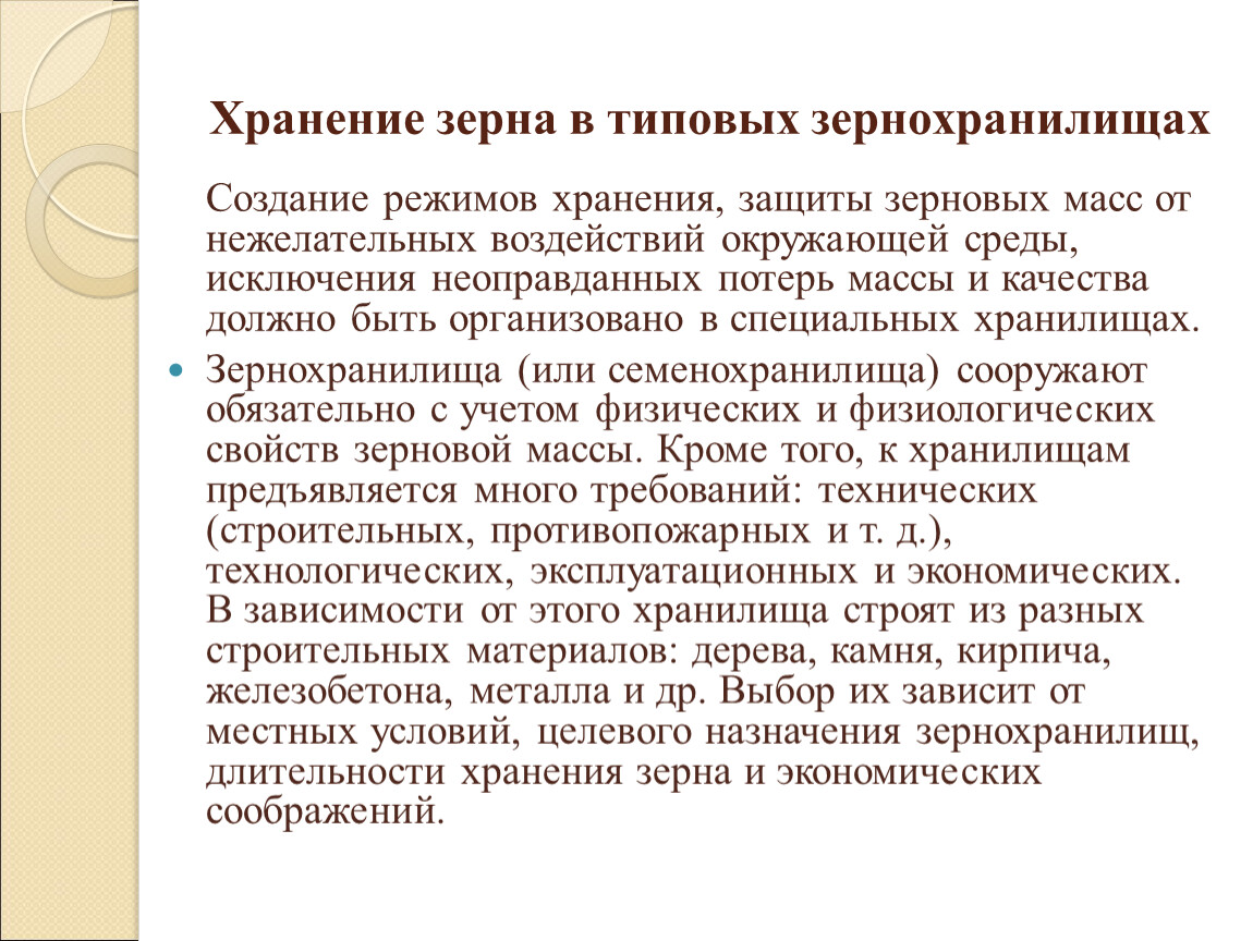 Зернохранилища (или семенохранилища) сооружают обязательно с учетом физических и физиологических свойств зерновой массы. Кроме того, к хранилищам предъявляется много требований: технических (строительных, противопожарных и т. д.), технологических, эксплуатационных и экономических. В зависимости от этого хранилища строят из разных строительных материалов: дерева, камня, кирпича, железобетона, металла и др. Выбор их зависит от местных условий, целевого назначения зернохранилищ, длительности хранения зерна и экономических соображений.
