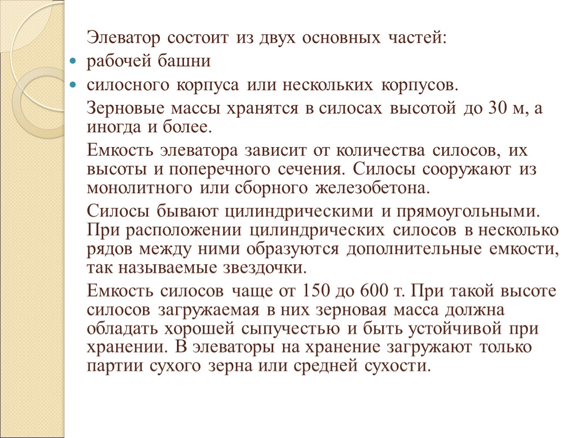 Емкость силосов чаще от 150 до 600 т. При такой высоте силосов загружаемая в них зерновая масса должна обладать хорошей сыпучестью и быть устойчивой при хранении. В элеваторы на хранение загружают только партии сухого зерна или средней сухости.