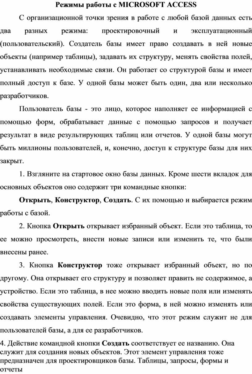 С организационной точки зрения в работе с любой базой данных есть два разных режима: проектировочный и эксплуатационный (пользовательский). Создатель базы имеет право создавать в ней новые объекты (например таблицы), задавать их структуру, менять свойства полей, устанавливать необходимые связи. Он работает со структурой базы и имеет полный доступ к базе. У одной базы может быть один, два или несколько разработчиков.