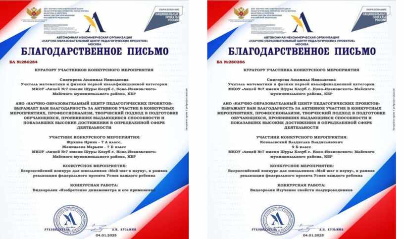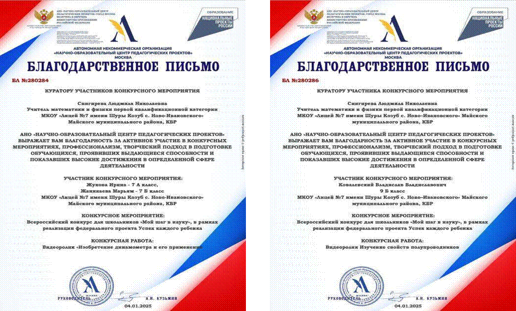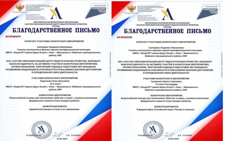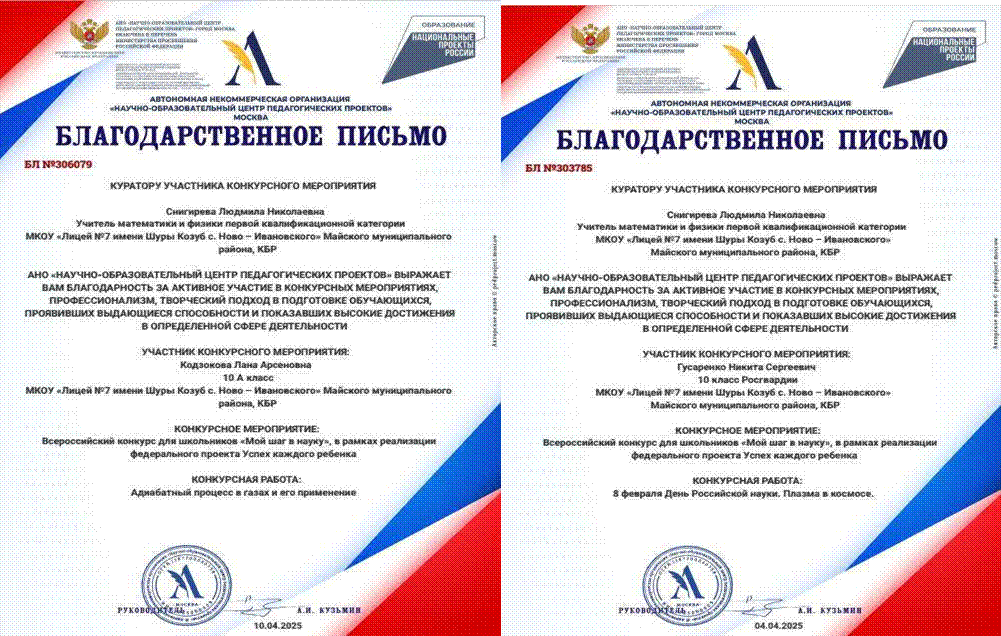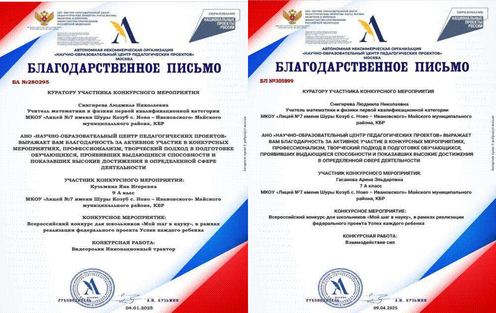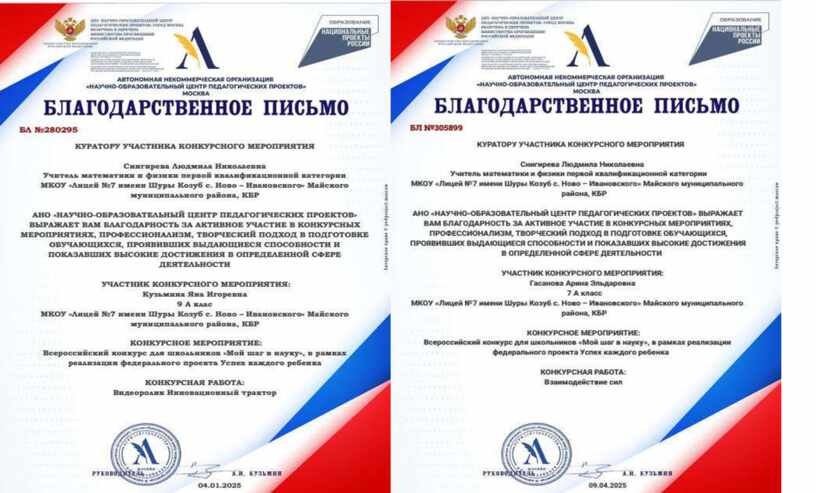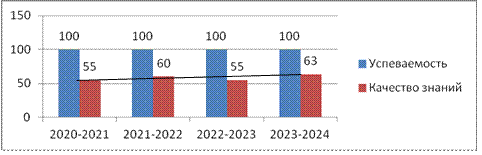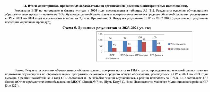 Вывод: Результаты освоения обучающимися образовательных программ по итогам ГИА с целью проведения независимой оценки качества подготовки обучающихся по образовательным программам основного и среднего общего образования, реализуемым в ОУ с 2021 по 2024 годы высокие. Средний показатель за 3 года ОГЭ составляет 83 % качества знаний обучающихся. Средний показатель за 3 года ЕГЭ составляет 47,6 баллов ((Отчет о результатах самообследования МКОУ «Лицей № 7 им. Шуры Козуб С. Ново-Ивановского» Майского Муниципального района КБР [3, с.122]).