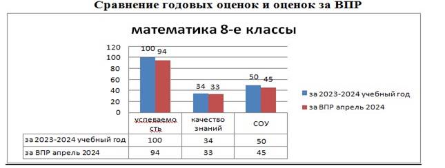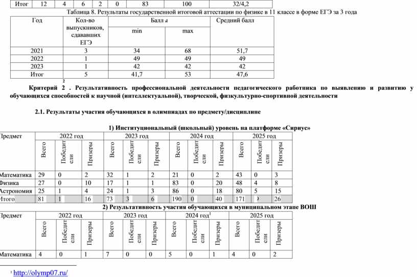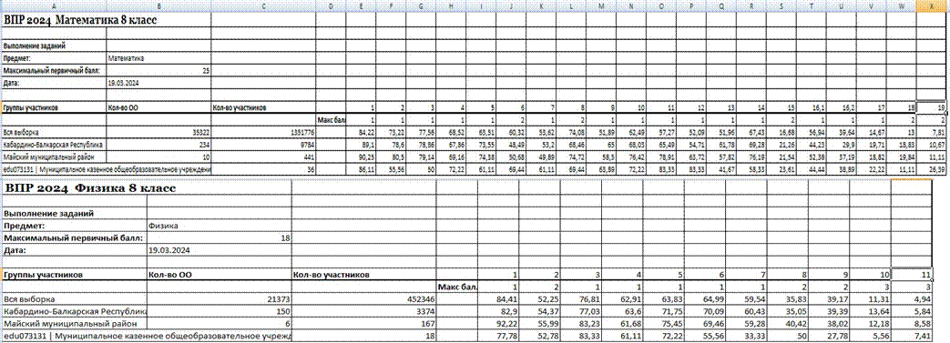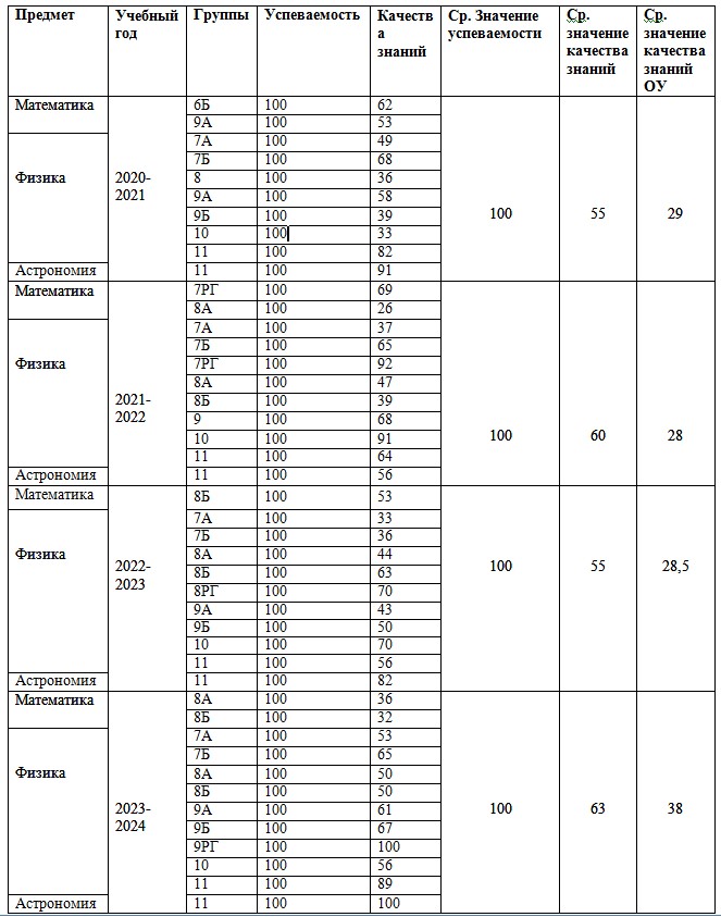 Результаты ВПР по математике и физике учителя в 2024 году представлены в таблицах 5,6 [11]. Результаты освоения обучающимися образовательных программ по итогам ГИА обучающихся по образовательным программам основного и среднего общего образования, реализуемым в ОУ с 2021 по 2024 годы представлены в таблицах 7,8 (см. Приложение 3. Выгрузка результатов ВПР из ФИС ОКО (представляют результаты последних оценочных процедур))