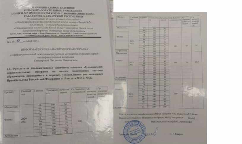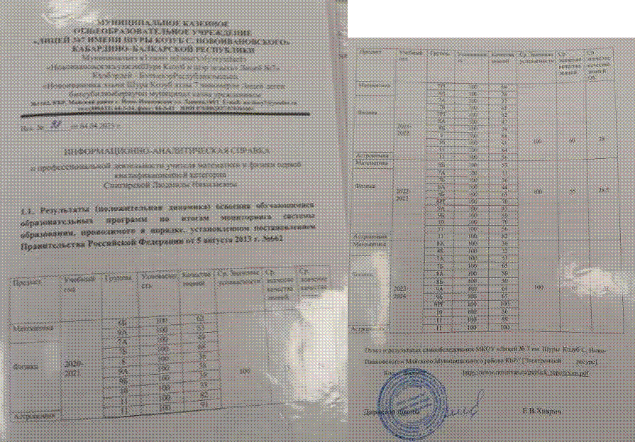 Как положительный результат своей деятельности хочу отметить: стабильную качественную успеваемость по предметам и высокий уровень качества знаний, даваемых учителем в таблице 4 (Отчет о результатах самообследования МКОУ «Лицей № 7 им. Шуры Козуб С. Ново-Ивановского» Майского Муниципального района КБР [3], с.108]).