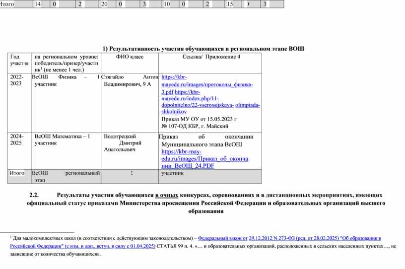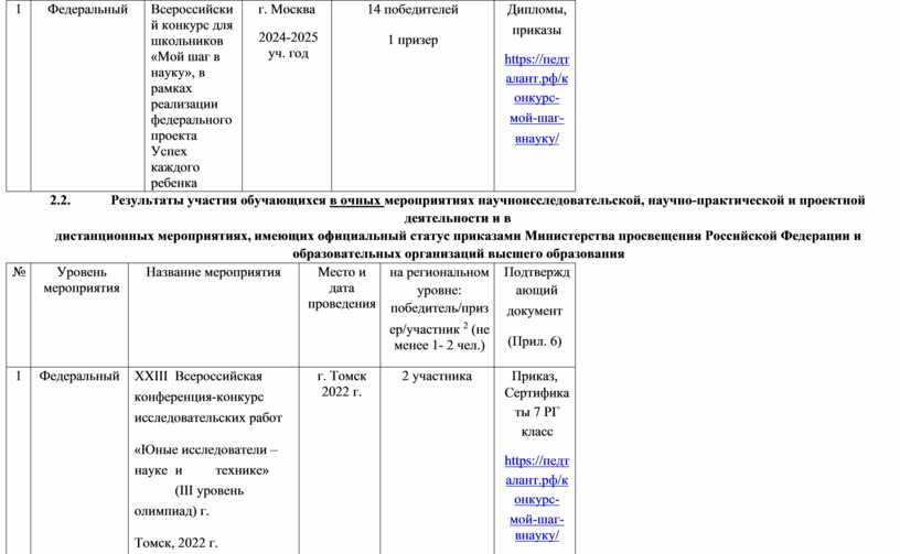 2.2. Результаты участия обучающихся в очных конкурсах, соревнованиях и в дистанционных мероприятиях, имеющих официальный статус приказами Министерства просвещения Российской Федерации и образовательных организаций высшего образования