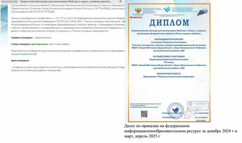 Дипломы, приказы https://педт алант.рф/к онкурс- мой-шаг-внауку/