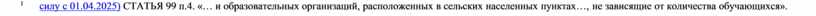 1 Для малокомплектных школ (в соответствии с действующим законодательством) – Федеральный закон от 29.12.2012 N 273-ФЗ (ред. от 28.02.2025) "Об образовании в Российской Федерации" (с изм. и доп., вступ. в силу с 01.04.2025) СТАТЬЯ 99 п.4. «… и образовательных организаций, расположенных в сельских населенных пунктах…, не зависящие от количества обучающихся».