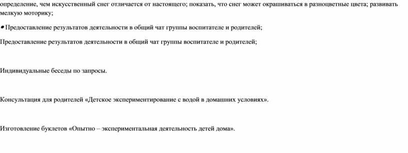 Консультация «Организация детского экспериментирования в домашних условиях». Индивидуальные беседы по запросу. Предоставление результатов деятельности в общий чат группы. |