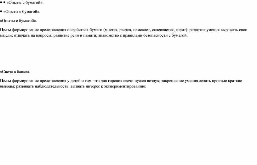 «Опыты с бумагой». Цель: формирование представления о свойствах бумаги (мнется, рвется, намокает, склеивается, горит); развитие умения выражать свои мысли; отвечать на вопросы; развитие речи и памяти; знакомство с правилами безопасности с бумагой.