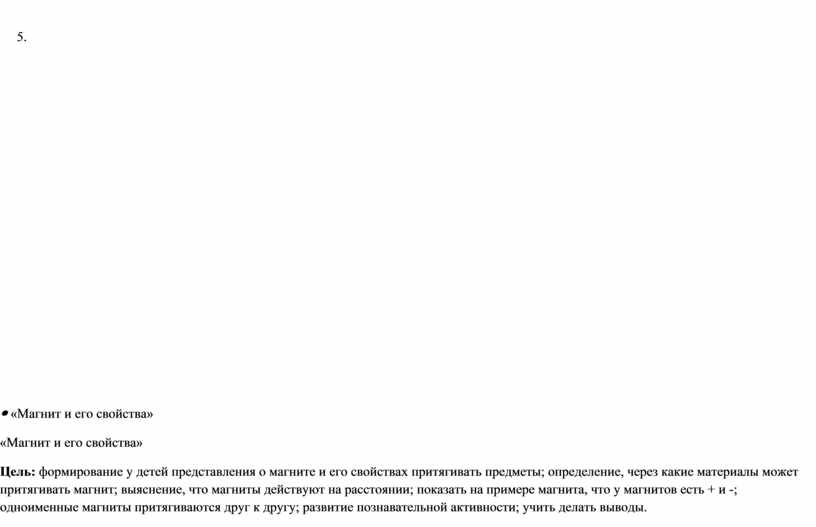 «Магнит и его свойства» Цель: формирование у детей представления о магните и его свойствах притягивать предметы; определение, через какие материалы может притягивать магнит; выяснение, что магниты действуют на расстоянии; показать на примере магнита, что у магнитов есть + и -; одноименные магниты притягиваются друг к другу; развитие познавательной активности; учить делать выводы. Магнитный театр «В гостях у сказки» Цель: воспитание интереса детей к устному народному творчеству; знакомство с новыми видами инсценировки знакомых сказок; развитие памяти и речи детей; побуждение к самостоятельной инсценировки знакомых сказок; развитие познавательной активности детей в процессе знакомства со свойствами магнита.