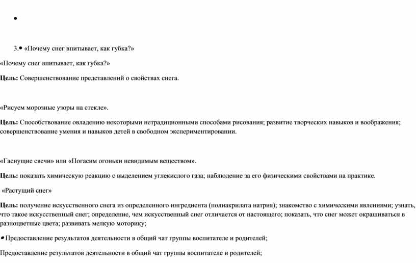«Гаснущие свечи» или «Погасим огоньки невидимым веществом». Цель: показать химическую реакцию с выделением углекислого газа; наблюдение за его физическими свойствами на практике. «Растущий снег» Цель: получение искусственного снега из определенного ингредиента (полиакрилата натрия); знакомство с химическими явлениями; узнать, что такое искусственный снег; определение, чем искусственный снег отличается от настоящего; показать, что снег может окрашиваться в разноцветные цвета; развивать мелкую моторику;
