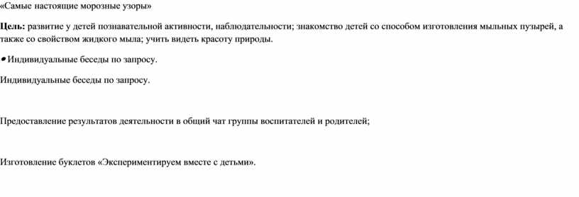 «Самые настоящие морозные узоры» Цель: развитие у детей познавательной активности, наблюдательности; знакомство детей со способом изготовления мыльных пузырей, а также со свойством жидкого мыла; учить видеть красоту природы.