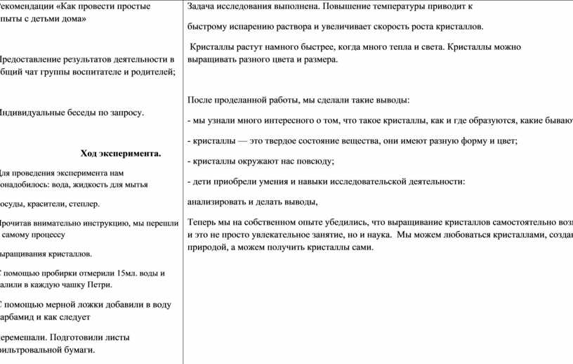 Задача исследования выполнена. Повышение температуры приводит к быстрому испарению раствора и увеличивает скорость роста кристаллов. Кристаллы растут намного быстрее, когда много тепла и света. Кристаллы можно выращивать разного цвета и размера.