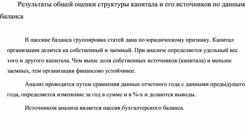 Результаты общей оценки структуры капитала и его источников по данным баланса
