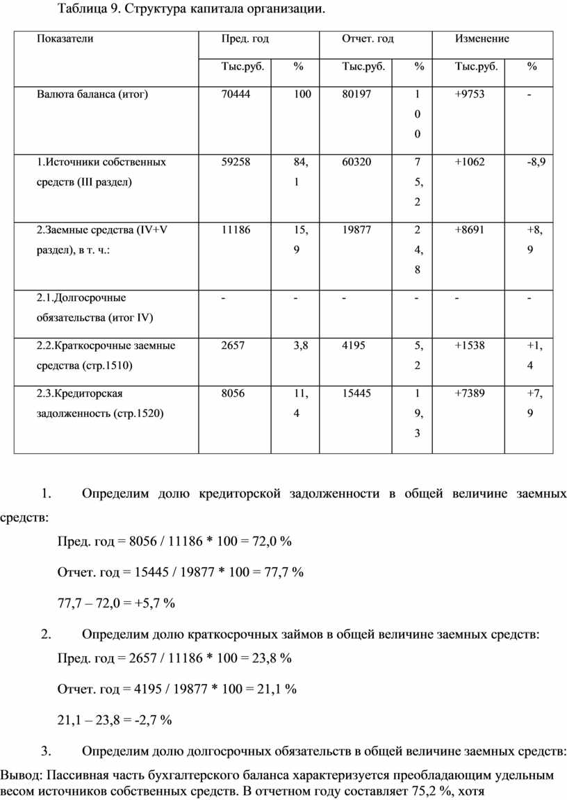 Вывод: Пассивная часть бухгалтерского баланса характеризуется преобладающим удельным весом источников собственных средств. В отчетном году составляет 75,2 %, хотя их доля в общем объеме средств сократилась на 8,9 %. Соответственно, возросла доля заемных средств на 8,9 % и в отчетном году удельный вес составил 24,8 %. Следовательно, в течение отчетного периода произошли изменения в структуре заемных средств.