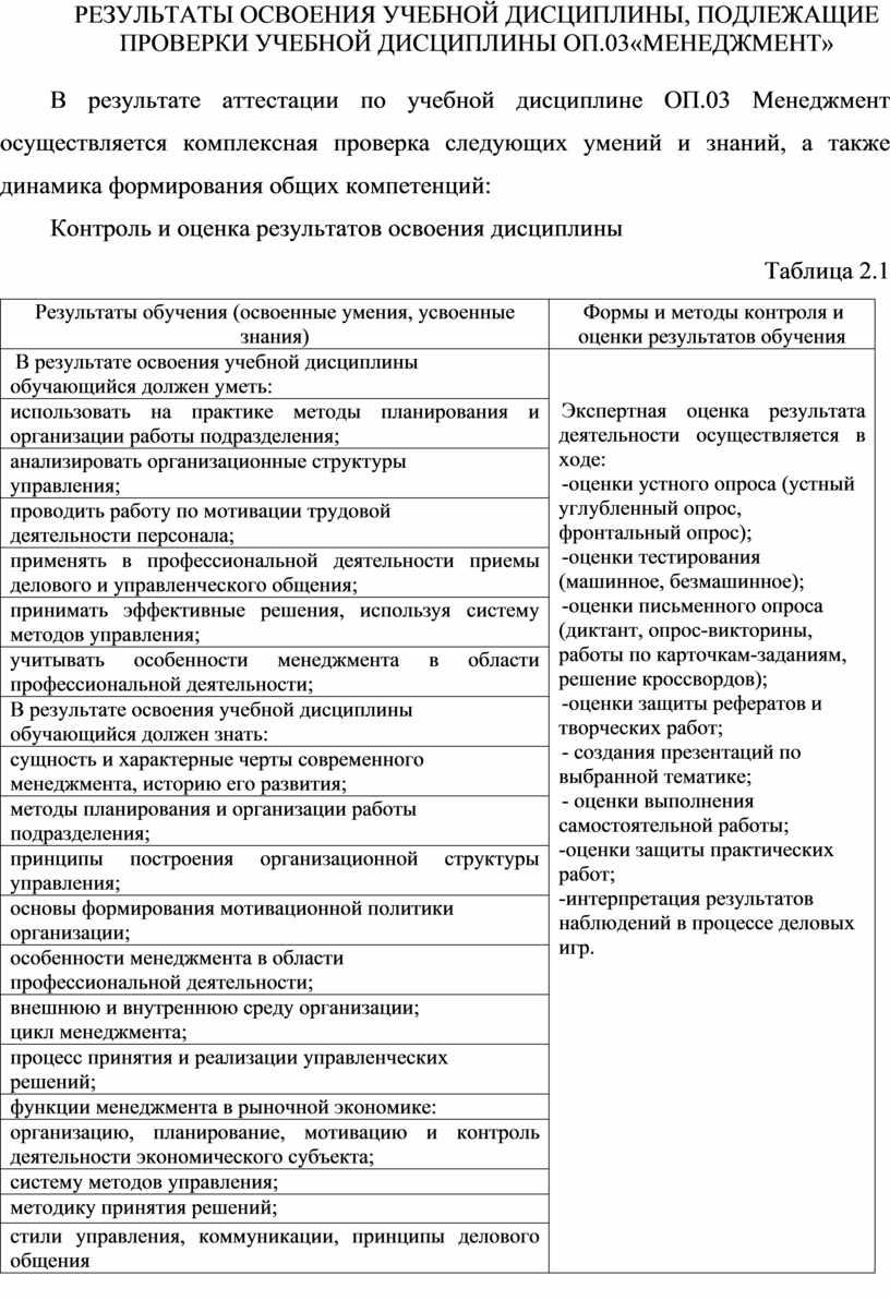 РЕЗУЛЬТАТЫ ОСВОЕНИЯ УЧЕБНОЙ ДИСЦИПЛИНЫ, ПОДЛЕЖАЩИЕ ПРОВЕРКИ УЧЕБНОЙ ДИСЦИПЛИНЫ ОП.03«МЕНЕДЖМЕНТ»