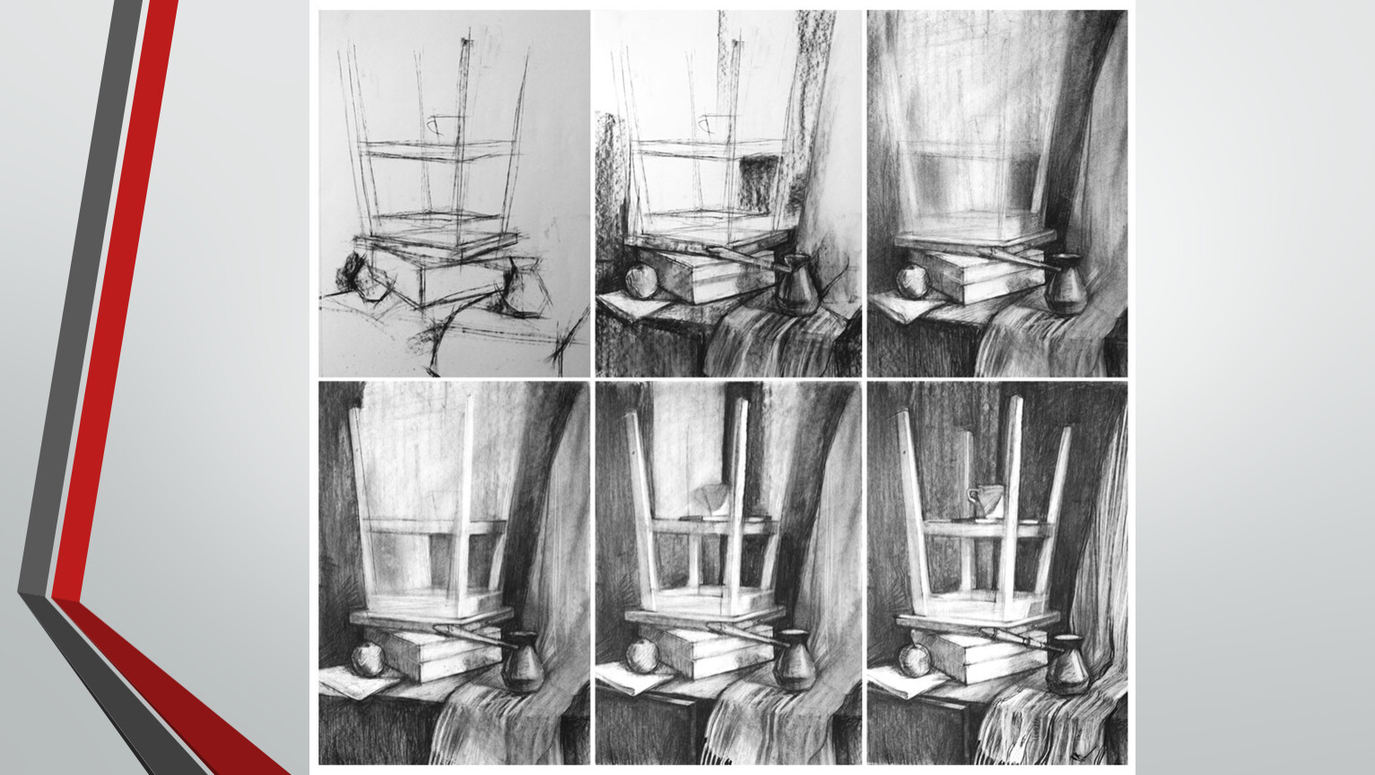 3. Работа тоном (можно выбрать любой материал: уголь, фломастеры, цветные карандаши), свето-теневая моделировка, обобщение, завершение работы.