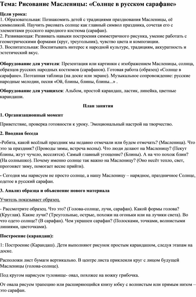 Оборудование для учителя: Презентация или картинки с изображением Масленицы, солнца, образцов русских народных костюмов (сарафанов). Готовая работа (образец) «Солнце в сарафане». Поэтапная таблица (на доске или экране). Музыкальное сопровождение: русские народные мелодии, песня «Ой, блины, блины, блины...» .