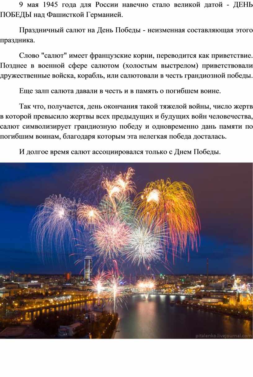 Так что, получается, день окончания такой тяжелой войны, число жертв в которой превысило жертвы всех предыдущих и будущих войн человечества, салют символизирует грандиозную победу и одновременно дань памяти по погибшим воинам, благодаря которым эта нелегкая победа досталась.